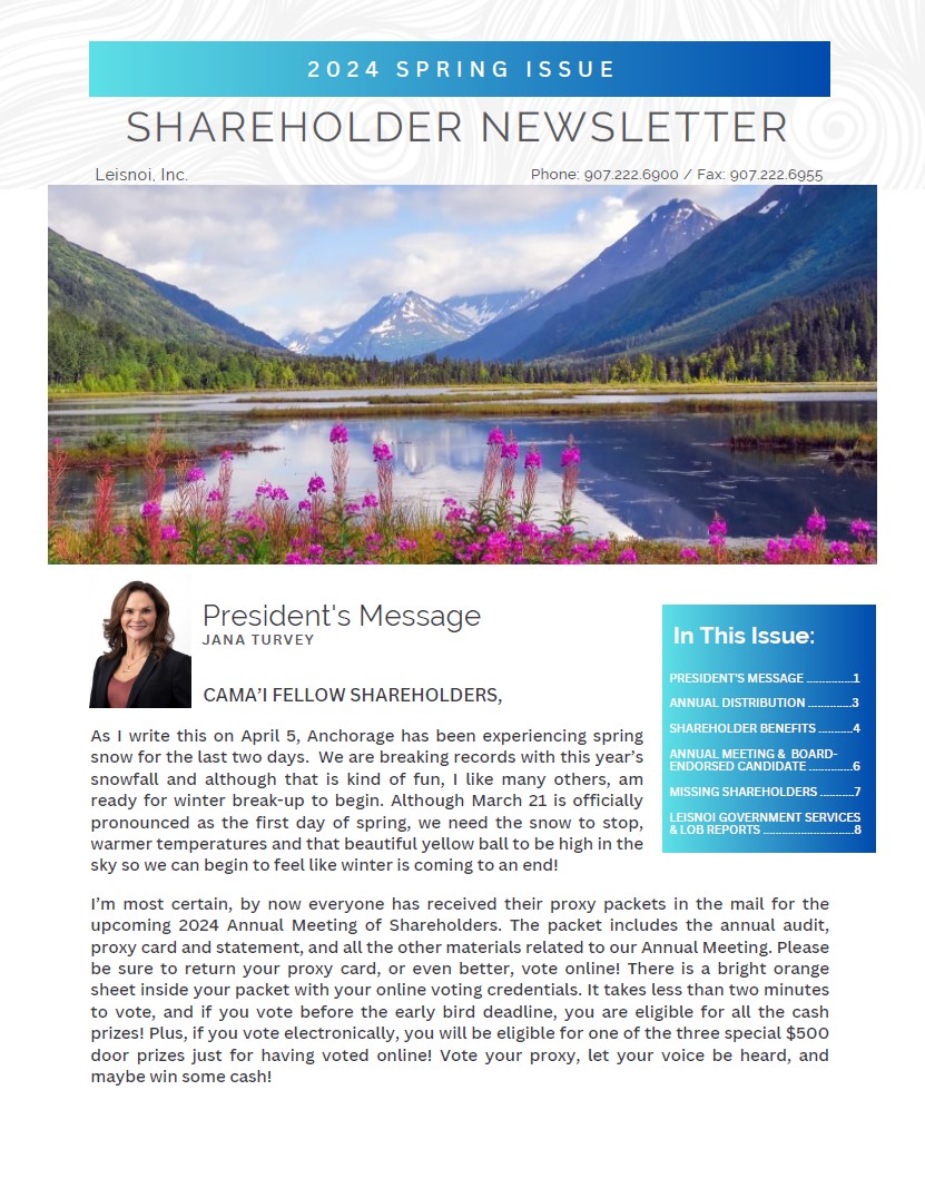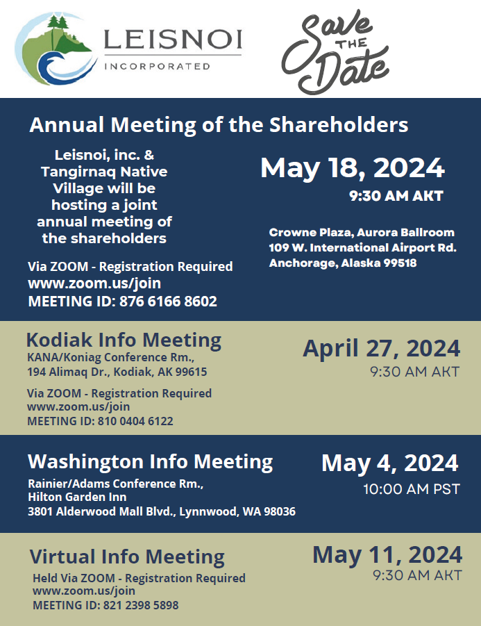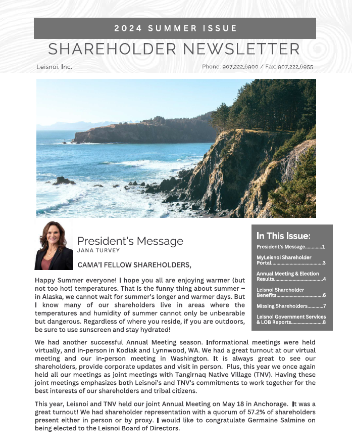 Leisnoi, Incorporated is an Alaska Native village corporation with roots on Woody Island in the Kodiak Island Archipelago. Our ancestors arrived in the area over 10,000 years ago, and today Leisnoi shareholders and descendants can be found in both our traditional home and throughout the United States.