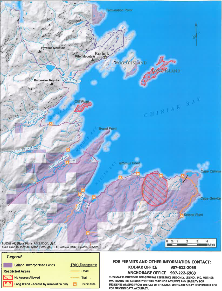 Leisnoi Shareholders, spouses, and first-line descendants are exempt from any of the land use permit fees on Leisnoi Lands. Senior Citizens (65+) who are residents of Kodiak, and Disabled Veterans with a disability rating of 50% or higher, are exempt from permit fees for Land Access and Camping permits.