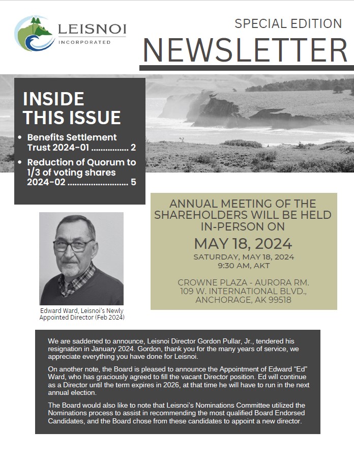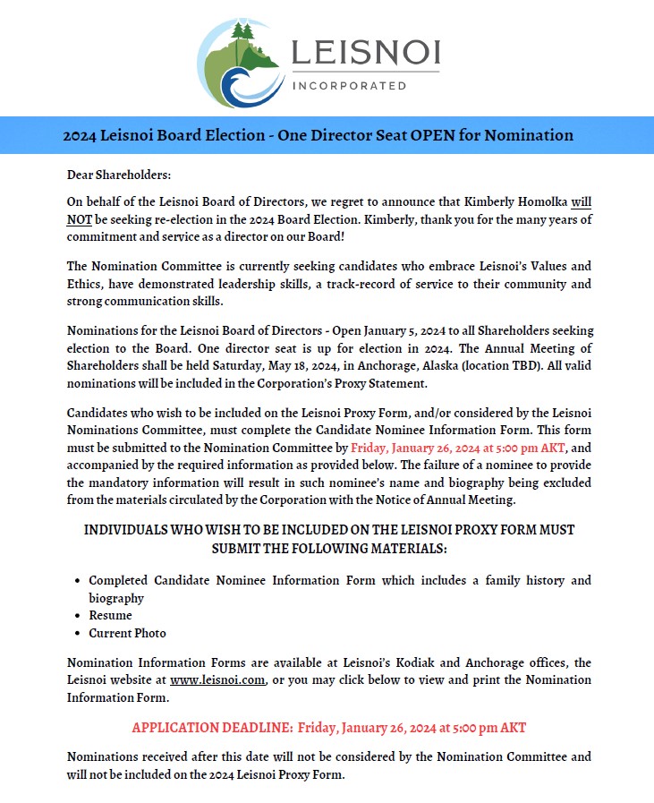 2024 Leisnoi Board Election – One Director Seat Open for Nomination
